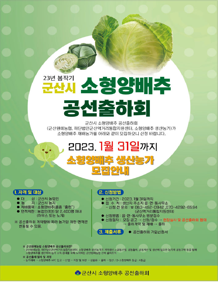 군산시 소형양배추 공선출하회(군산원예농협, 재단법인군산먹거리통합지원센터, 소형양배추 생산농가)가 소형양배추 재배농가를 아래와 같이 모집하오니 신청바랍니다.